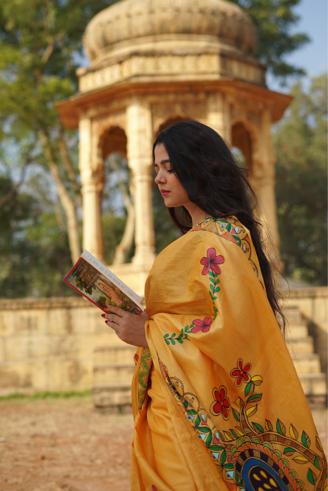 Indulge in the regal charm of this Golden Aura Kosa Silk Saree, beautifully adorned with vibrant yellow peacock motifs in traditional Madhubani art. This saree combines luxurious fabric with exquisite artwork, creating a masterpiece perfect for cultural celebrations and festive occasions.
