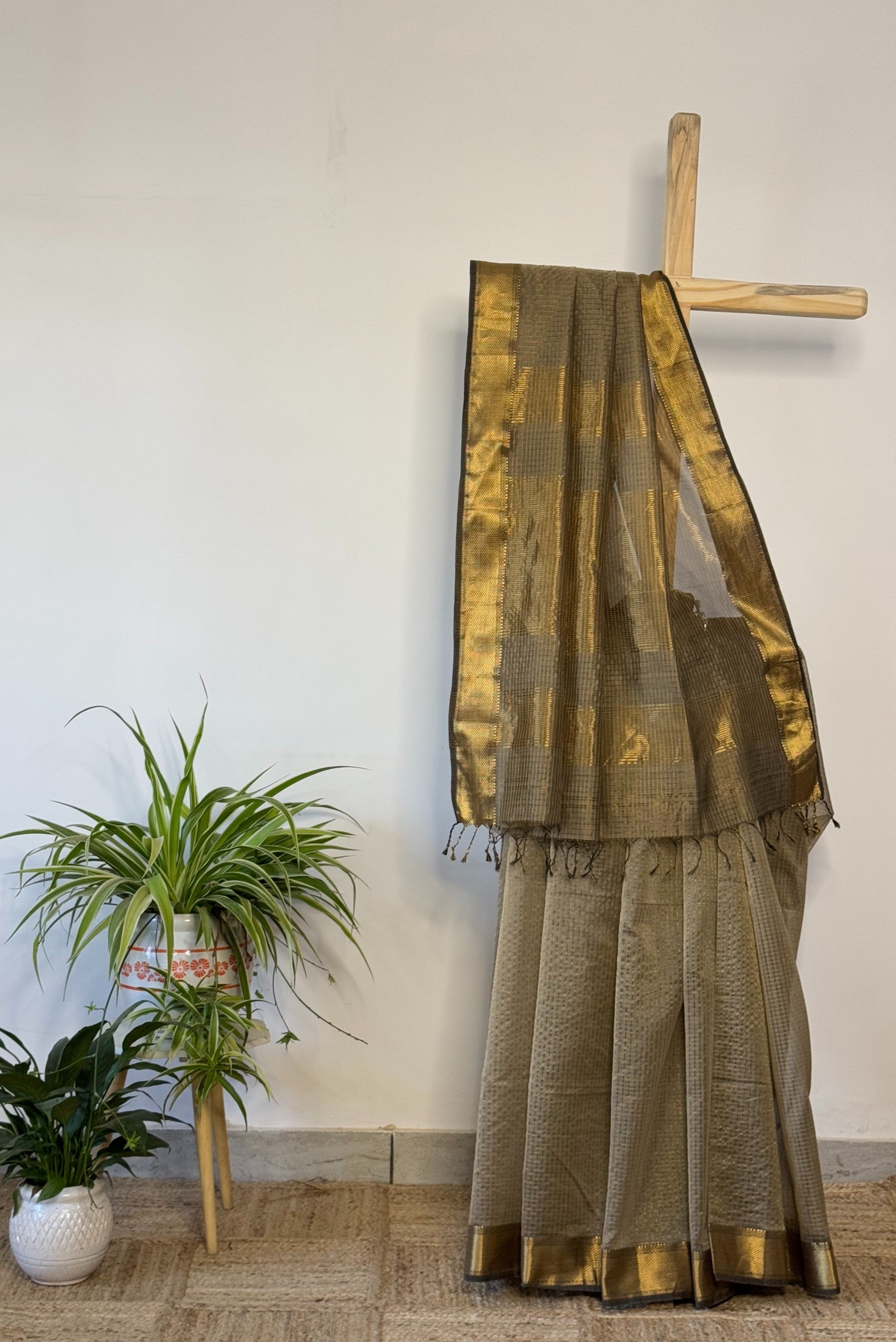 Drape yourself in sophistication with this Gray Broad zari checks Saree, crafted from a luxurious cotton-silk blend. The delicate interplay of traditional weaving and intricate borders adds a regal touch, making it a timeless addition to your wardrobe.