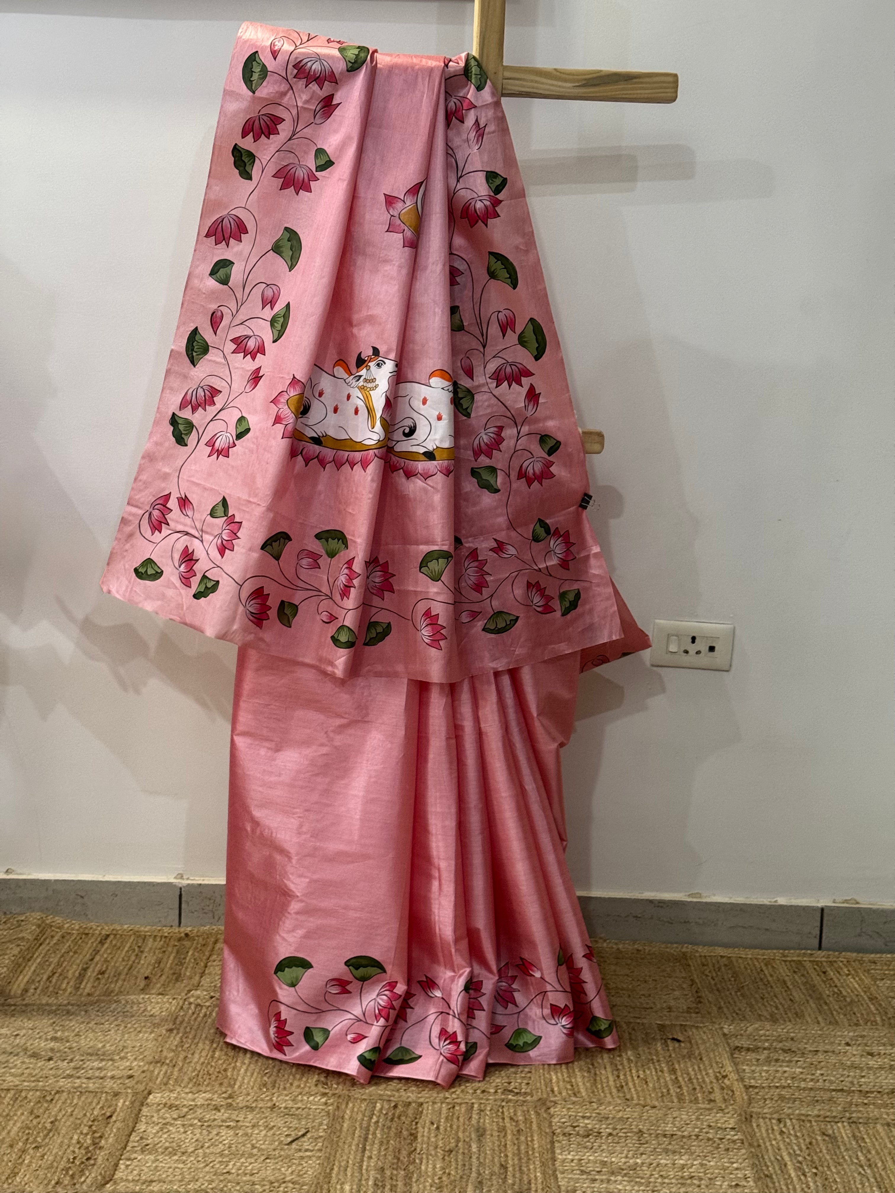Embrace timeless elegance with this Pink Kosa Silk Saree, adorned with intricate Pichwai-inspired lotus and cow motifs. The delicate artwork pays homage to traditional Indian heritage, making it a must-have for cultural and festive occasions.
