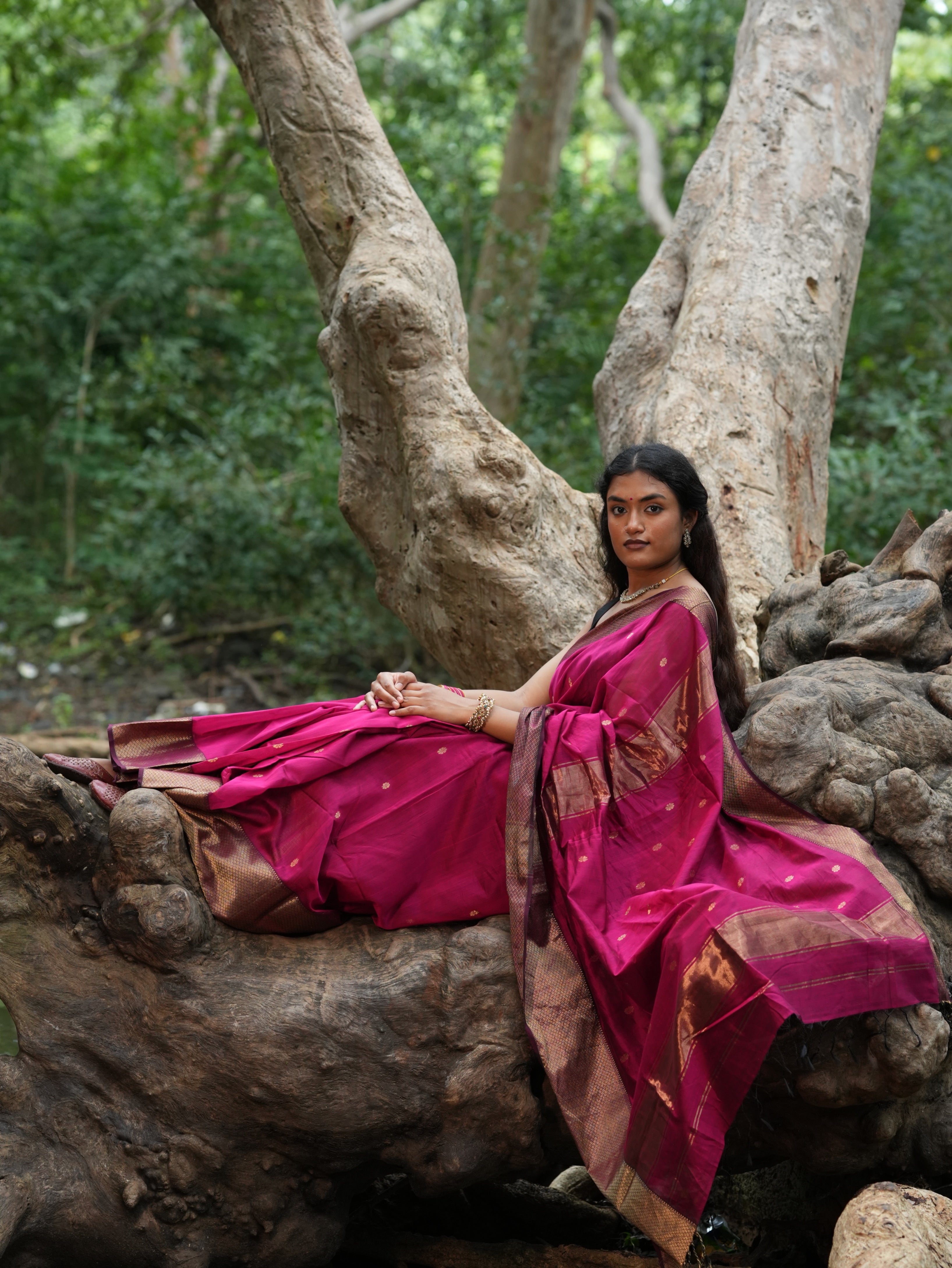 Step into the spotlight with the Royal Bloom Rani Pink Maheshwari Silk Saree, featuring a broad zari border and beautiful flower-shaped zari bootis scattered across the saree. The striking Rani Pink hue adds a touch of regal charm, while the intricate zari work elevates its opulence. Perfect for weddings, festive celebrations, or grand occasions, this saree promises to make you feel like royalty.